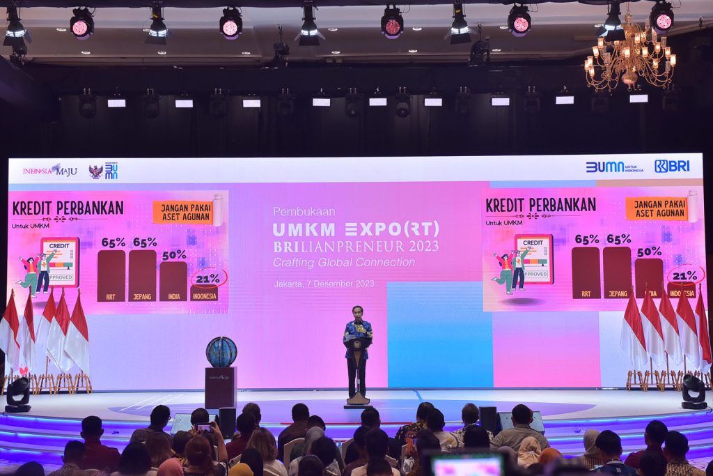 “Yang selalu saya dorong yang berkaitan dengan pembiayaan. Pembiayaan UMKM ini harus dipermudah, karena kalau kita lihat penyaluran kredit perbankan ke UMKM ini baru 21 persen dari total kredit yang ada. Dan yang paling gede memang di BRI,” ujar Presiden.