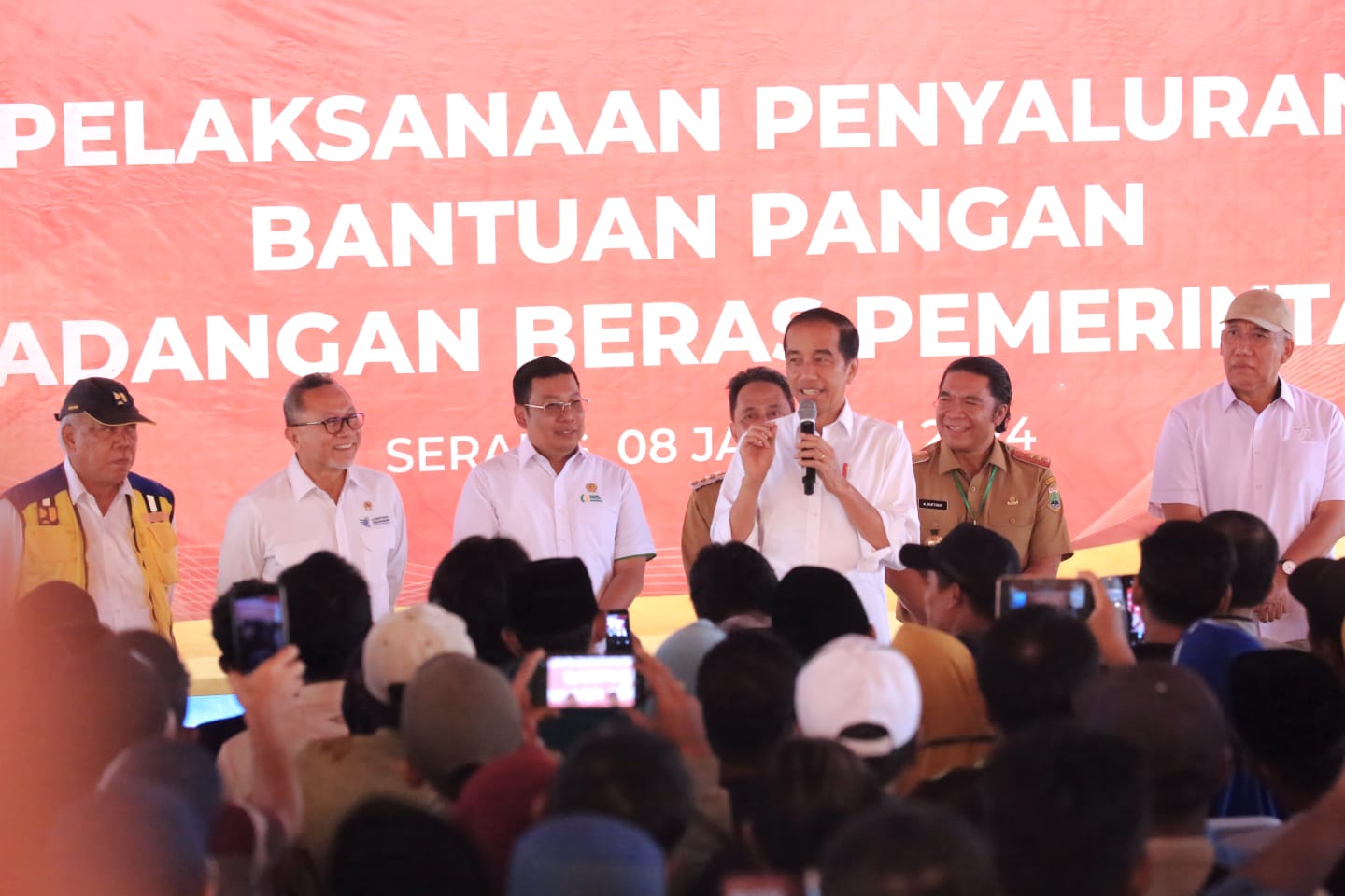Kota Serang, Suaraaspirasi.id – Penjabat (Pj) Gubernur Banten Al Muktabar mendampingi Presiden RI Joko Widodo tinjau Gudang Beras Bulog (GBB) Umbul Tengah Sub Divre Serang di Jl Raya Cilegon Km. 3,5 Drangong, Kota Serang, Senin, (08/01/2024). Presiden Jokowi juga melakukan penyerahan bantuan pangan Cadangan Beras Pemerintah (CBP) kepada masyarakat Keluarga Penerima Manfaat (KPM) di Kota Serang.
