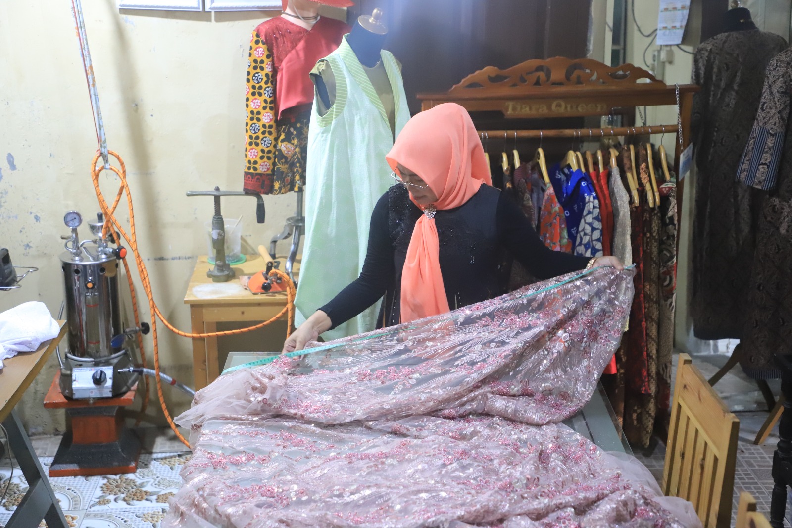 Berdiri sejak 2008, Owner Tiara Queen Fashion Tiara Wati mengatakan, baju-baju yang dijual merupakan rancangannya sendiri. Tak hanya itu, proses produksi dari mulai pola gambar, cutting, hingga jahitnya pun ia kerjakan sendiri. Sedangkan untuk pengemasan dan pemasangan payet, ia memberdayakan warga sekitar untuk membantu menambah penghasilan mereka.