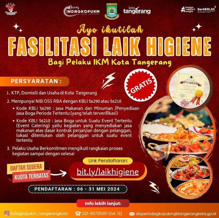Tangerang, Krakataupos.com – Dinas Perindustrian, Perdagangan, Koperasi, Usaha Kecil dan Menengah (Disperindagkop UKM) Kota Tangerang membuka pendaftaran Fasilitasi Laik Higiene gratis bagi pelaku Industri Kecil Menengah (IKM) Kota Tangerang, pada 6 hingga 31 Mei mendatang.
