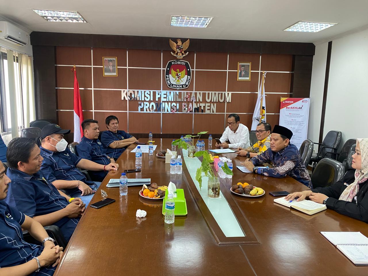Bertempat di Aula KPU Provinsi Banten, Ketua PWI Provinsi Banten Rian Nopandra didampingi Sekretaris Fahdi Khalid, Ketua Bidang Organisasi Teguh Akbar Idham serta para pengurus PWI Provinsi Banten disambut oleh Ketua KPU Banten Mohamad Ihsan, Anggota KPU Provinsi Banten Akhmad Subagja dan Agus Muslim