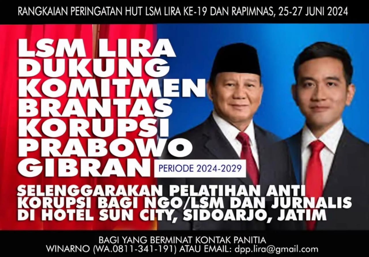 Pelatihan anti korupsi bagi LSM dan Jurnalis (Media) tersebut akan dilaksanakan tanggal 25-27 Juni 2024 di Hotel Sun City, Sidoarjo, Jawa Timur. Kegiatan ini merupakan rangkaian peringatan HUT ke-19 LSM LIRA (Lumbung Informasi Rakyat) —19 Juni 2005-19 Juni 2024). LIRA merupakan satu-satunya LSM terbesar dan terbanyak cabangnya dengan Rekor Muri (38 Propinsi, 514 Kabupaten Kota)