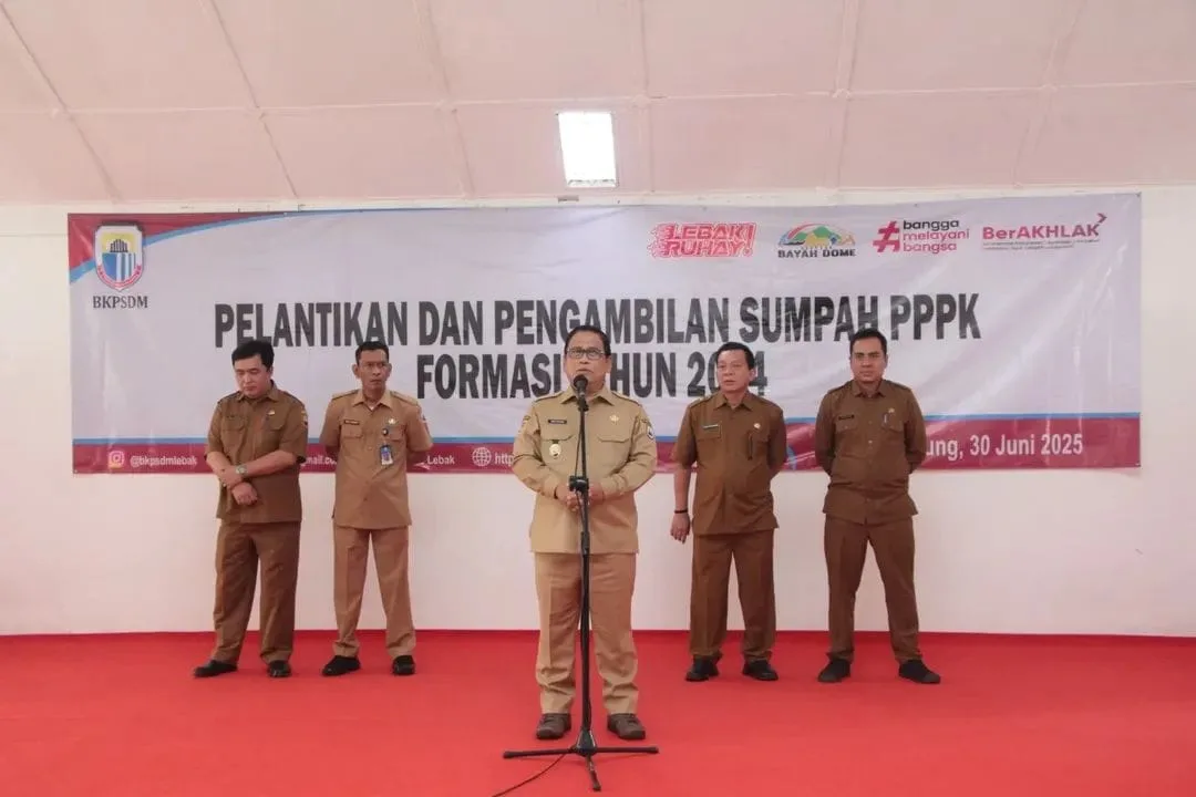 Lebak, Krakataupos.com – Wakil Bupati Lebak Amir Hamzah melantik dan mengambil sumpah Pegawai Pemerintah Perjanjian Kerja (PPPK) formasi Tahun 2024 tahap 1 dilantik dan diambil sumpah pada Senin, 30 Juni 2025 bertempat di Pendopo Kabupaten Lebak. Turut hadir dalam kesempatan tersebut Sekretaris Daerah Kabupaten Lebak, Asistsen Daerah Bidang Administrasi Umum, Kepala BKPSDM serta Kepala BKAD.