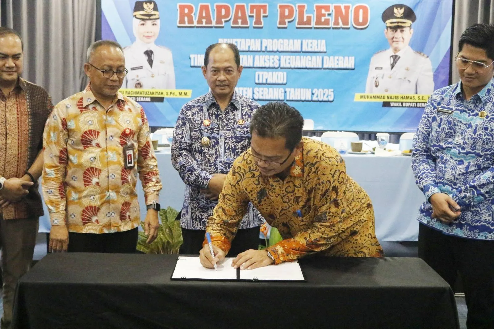 Rapat Pleno di pimpin oleh Wakil Bupati Serang Muhammad Najib Hamas. Turut hadir Perwakilan Otoritas Jasa Keuangan (OJK), Ketua TPAKD Kabupaten Serang yang juga Asda II Bidang Pembangunan, Febriyanto ZS, Staf Ahli Bupati Bidang Pembangunan Ekonomis dan Keuangan, Zaldi Dhuhana, Kabag Perekonomian dan SDA, Febrian Ripera. Kemudian para Kepala OPD Kabupaten Serang terkait, dan perwakilan dan perbankan serta instansi vertikal terkait lainnya.