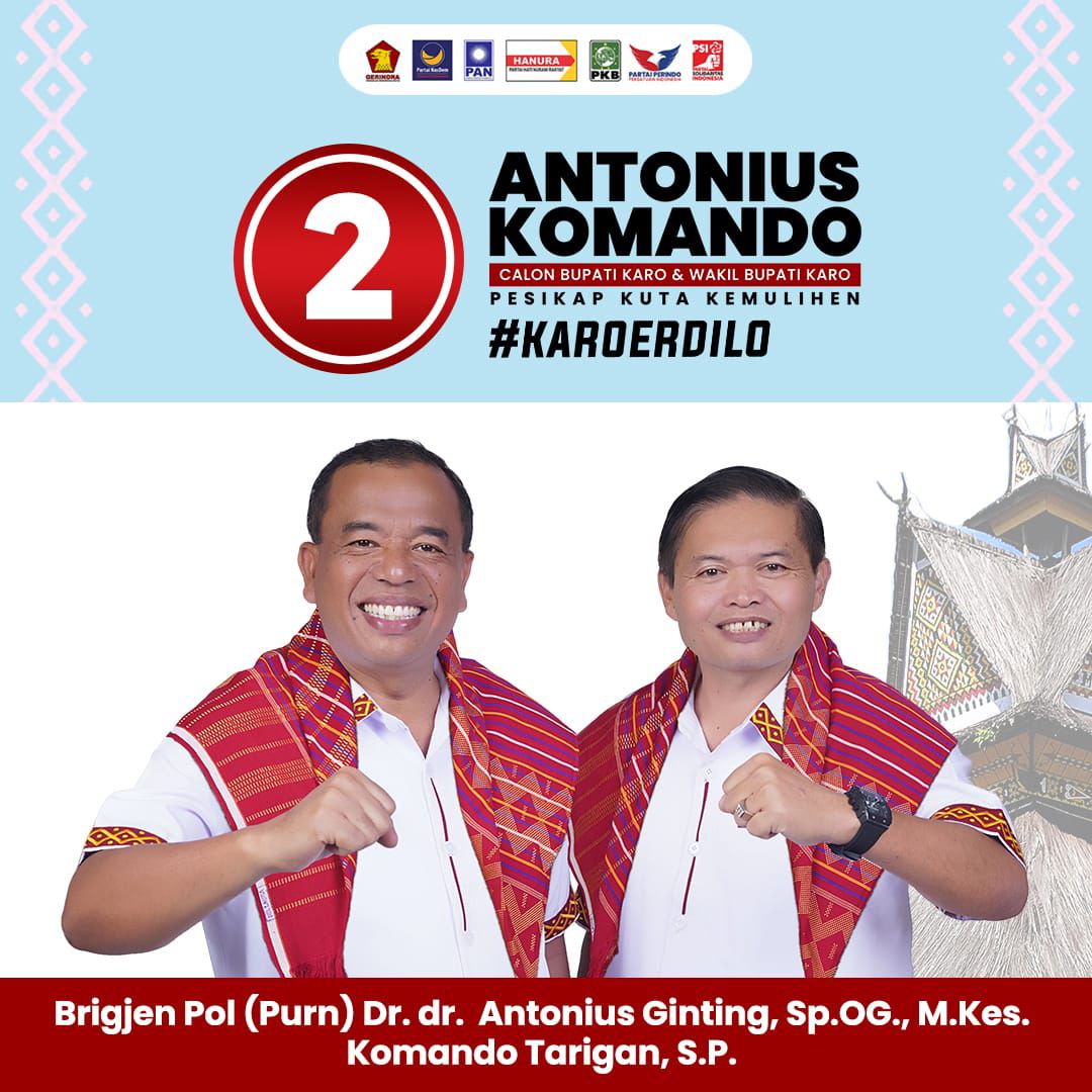 BERASTAGI KARO, Krakataupos.com – Pasangan Calon Bupati dan Wakil Bupati Brigjen Pol Purn Dr.dr Antonius Ginting,Sp.OG,M.Kes/Komando Tarigan S.P mendapat nomor urut 2 mengatakan hadir ditanah Karo membawa perubahan, mewujudkan Karo beriman,Karo berbudaya,Karo modern,Karo unggul menuju Karo sejahtera yang berkelanjutan.