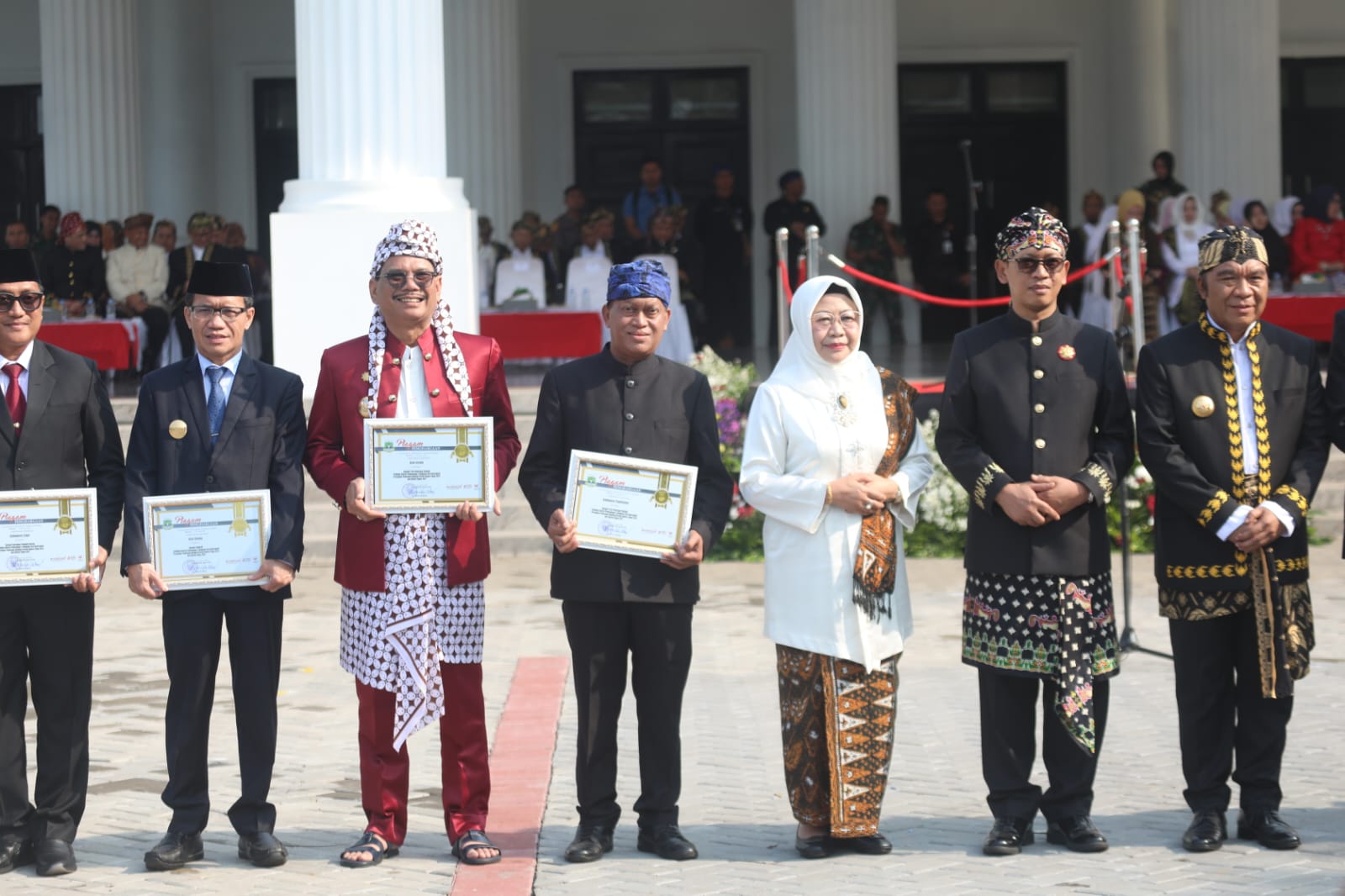 Penjabat (Pj) Wali Kota Serang Nanang Saefudin yang hadir dalam Upacara Hari Ulang Tahun (HUT) ke-24 Provinsi Banten secara langsung menerima piagam penghargaan tersebut dengan pakaian adat Kota Serang.