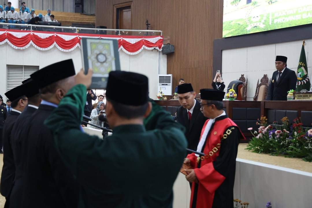 Prosesi pengucapan sumpah/ janji pimpinan DPRD Provinsi Banten dipimpin oleh Wakil Pengadilan Tinggi Banten Aroziduhu Waruwu. Acara dilanjutkan dengan penandatanganan berita acara dan penyerahan secara simbolis dari pimpinan DPRD Banten sementara kepada pimpinan definitif. (Adt)