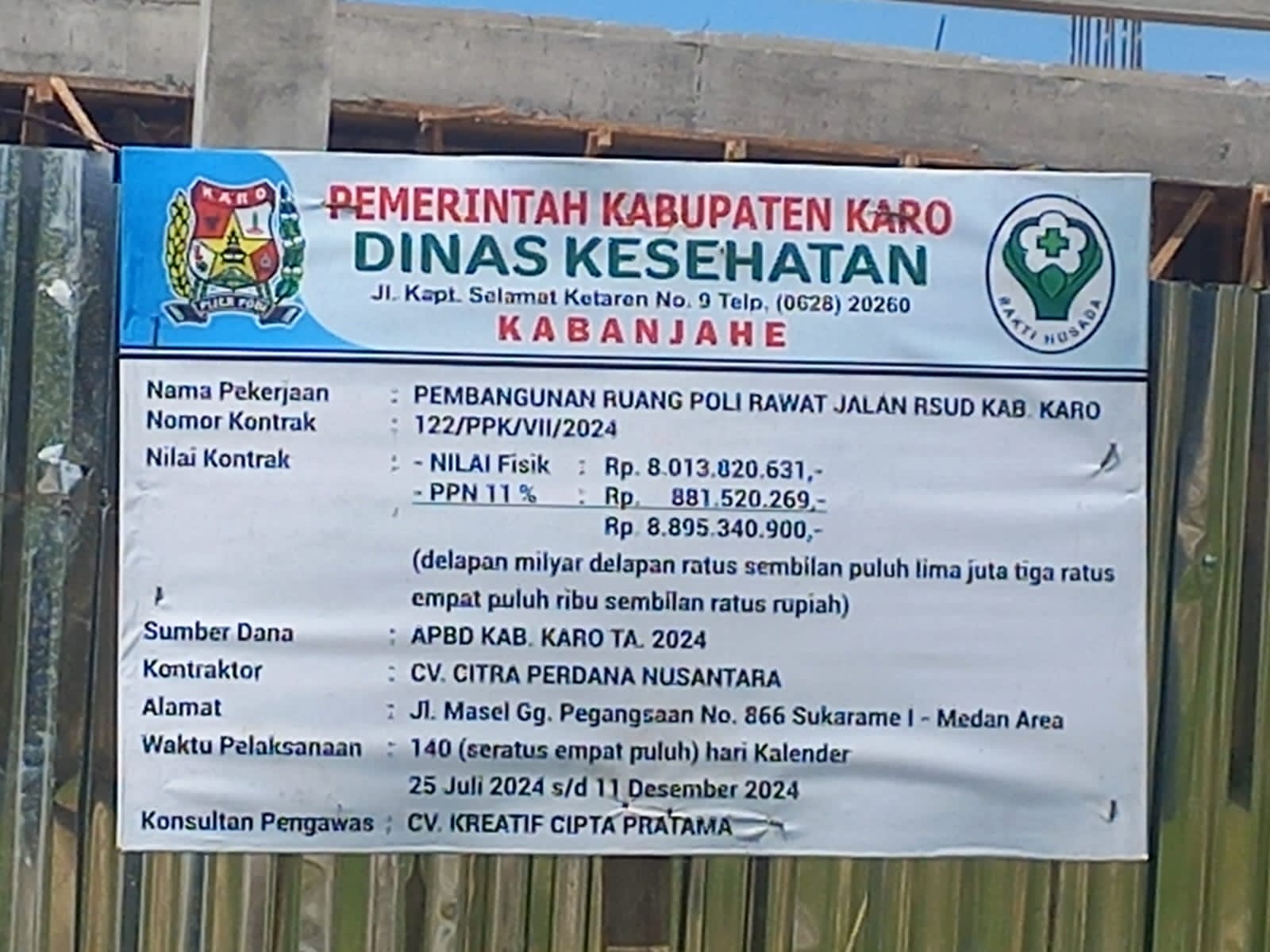 Temuan awak media di lokasi antara lain adalah : Ruang Poli Rawat Jalan RSUD Kab. Karo. Nomor Kontrak 122/PPK/VII/2024. Dilaksanakan melalui sumber dana APBD Kabupaten Karo TA 2024. Dengan nilai fisik Rp. 8.013.820.631 dan PPN Rp. 881.520.269 dengan total sebanyak Rp. 8.895.340.900 (delapan miliar delapan ratus sembilan puluh lima juta tiga ratus empat puluh ribu sembilan ratus rupiah) melalui kontraktor CV. SITRA PERDANA NUSANTARA Jl.Masel Gg. Pegangsaan No. 866 Sukaramai I-Medan Area 140 (seratus empat puluh hari kalender) 25 Juli 2024 s/d 11 Desember 2024. Konsultan Pengawas CU Kreatif Cipta Pratama.