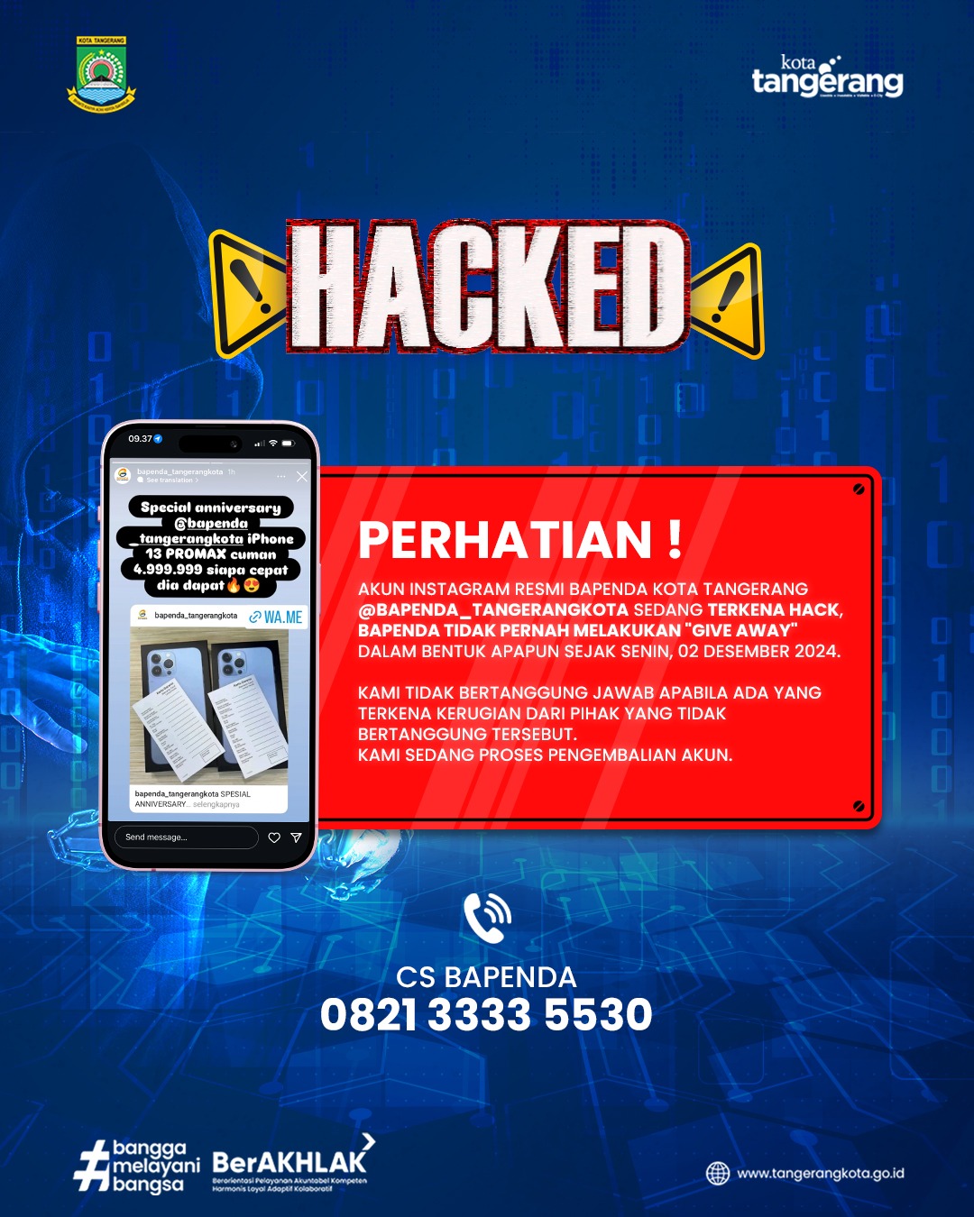 “Kami sampaikan bahwa akun resmi Instagram @bapenda_tangerangkota saat ini tengah mengalami gangguan serius akibat diretas pihak yang tidak bertanggung jawab,” ungkap Kiki saat dihubungi Tangerang TV.