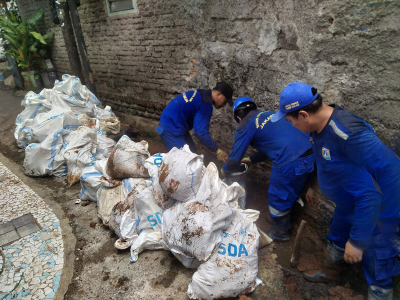 Kasatpel SDA Kecamatan Kramat Jati, Muchlis mengatakan, personel satgas mengangkat puing longsoran dari dalam saluran dan mempersiapkan material batu kali untuk pembuatan turap baru.