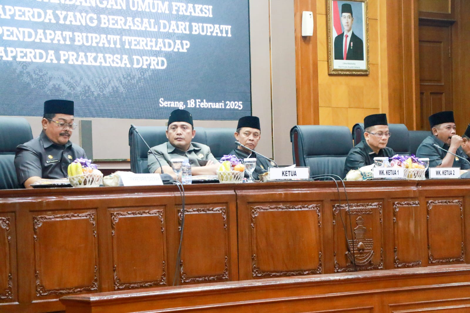 Persetujuan terungkap pada Rapat Paripurna DPRD Kabupaten Serang Penyampaian Pandangan Umum Fraksi Terhadap Raperda yang Berasal dari Bupati dan Pendapat Bupati terhadap Raperda Prakarsa DPRD di gedung dewan setempat pada Selasa, 18 Februari 2025.