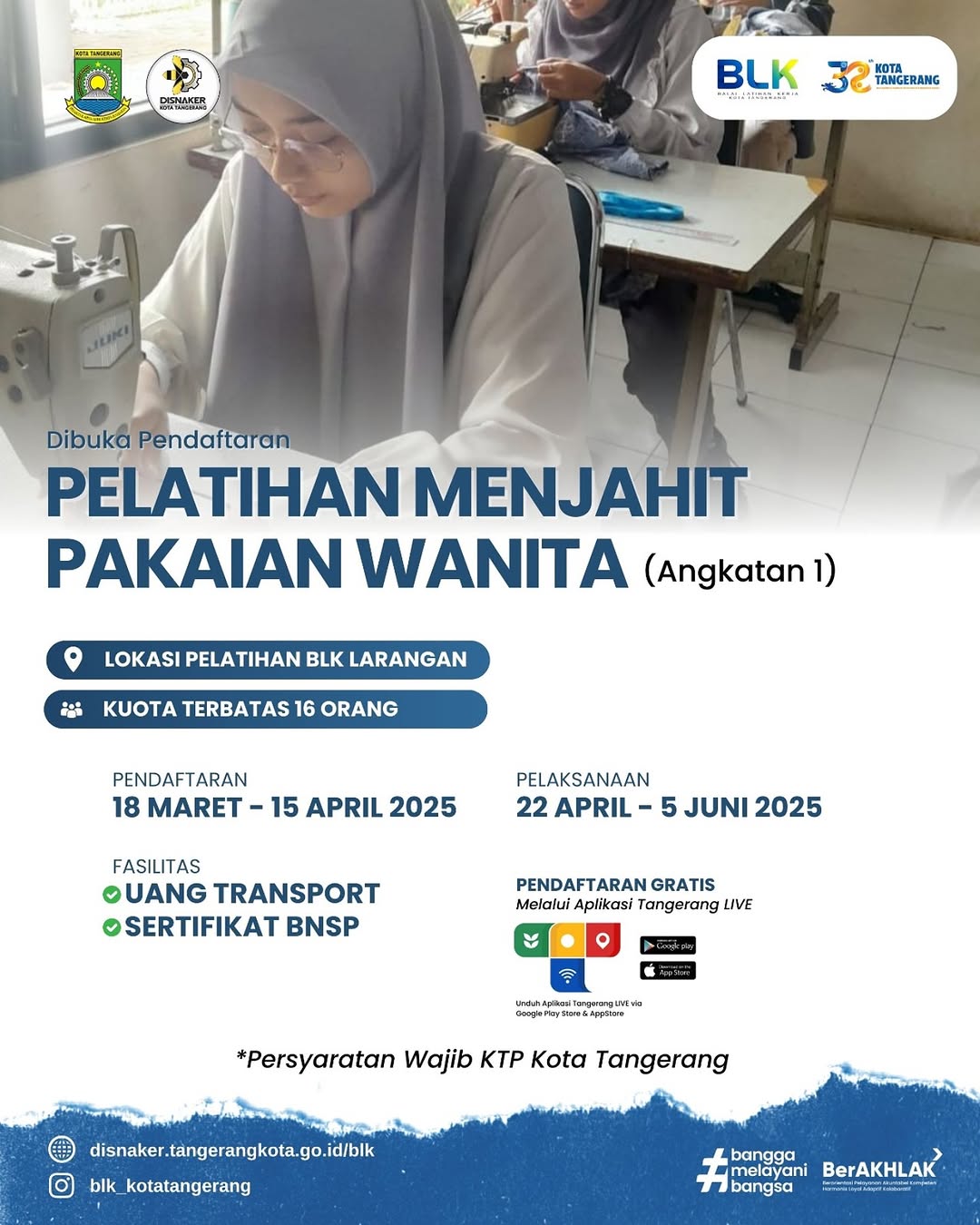 Kepala BLK Kota Tangerang Yasin Surya mengatakan, kuota yang disediakan untuk angkatan pertama pelatihan menjahit pakaian wanita adalah sebanyak 16 peserta. Pendaftaran telah dimulai sejak 18 Maret 2025 lalu dan akan ditutup pada 15 April 2025.