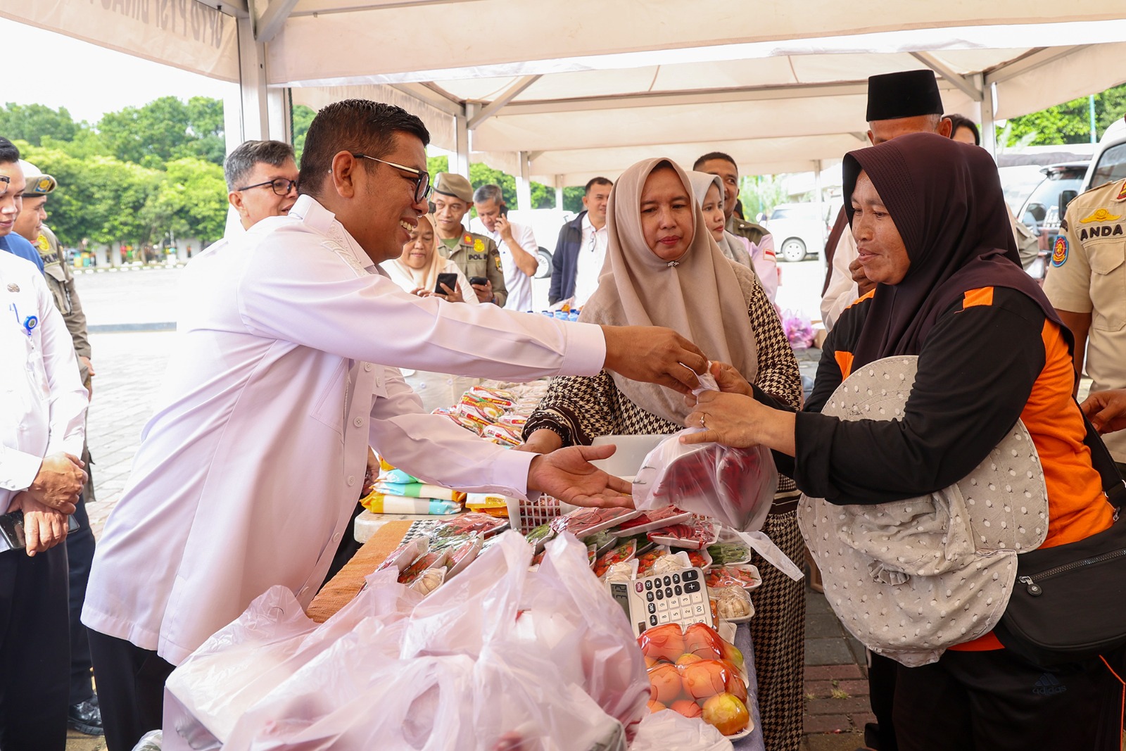 Di Pasar Murah Ramadan 1446 H itu tersedia beras, bawang merah, bawang putih, cabai, tomat, Minyakita, aneka buah-buahan, dan snack.