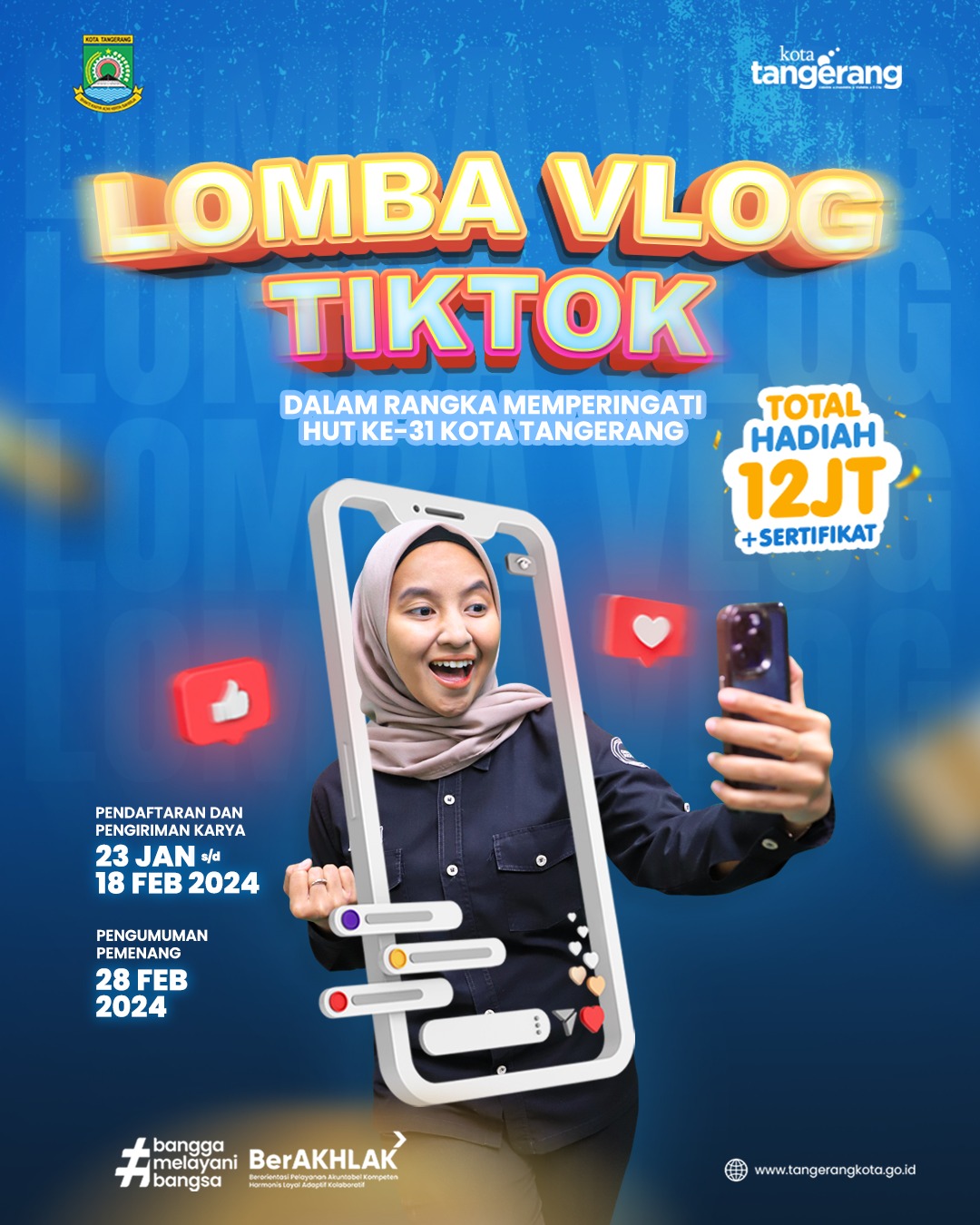 “Sebagai salah satu rangkaian menjelang HUT Ke-31 Kota Tangerang, kami menggelar perlombaan vlog TikTok yang dapat diikuti oleh masyarakat umum dengan total hadiah Rp 12 juta,” ungkapnya, Selasa (30/01/24).