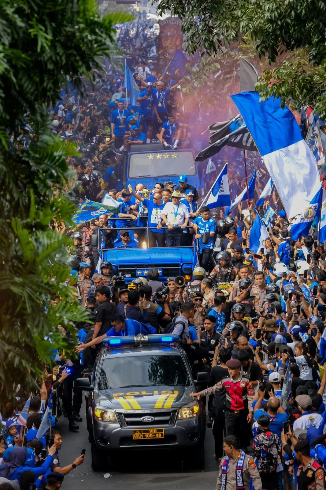 Iring-iringan motor, mobil pick-up, hingga truk yang dihias bendera Persib memenuhi jalan, diiringi sorak-sorai dan lagu-lagu kemenangan.