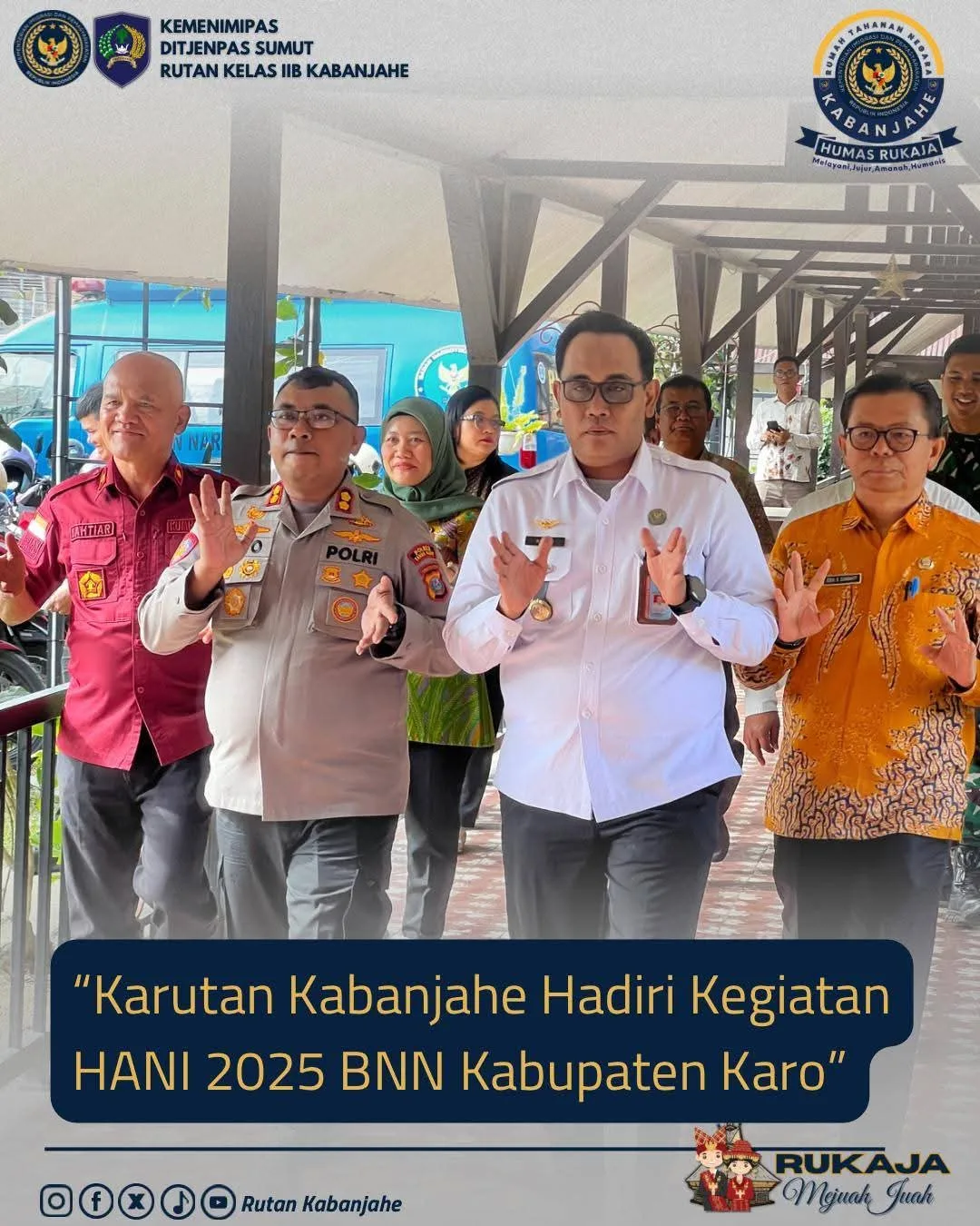 KARO, SUMUT – Bentuk komitmen kuat,Rutan Kabanjahe dalam mendukung gerakan anti narkoba nasional dan berperan aktif dalam menciptakan lingkungan masyarakat yang bebas dari ancaman narkoba,Kepala Rumah Tahanan (Karutan) Kelas IIB Kabanjahe,Bahtiar Sembiring,S.H didampingi KA.KPR,Feli Priatna Tarigan,S.Tr.Pas menghadiri Peringatan Hari Anti Narkotika Internasional (HANI) Tahun 2025.