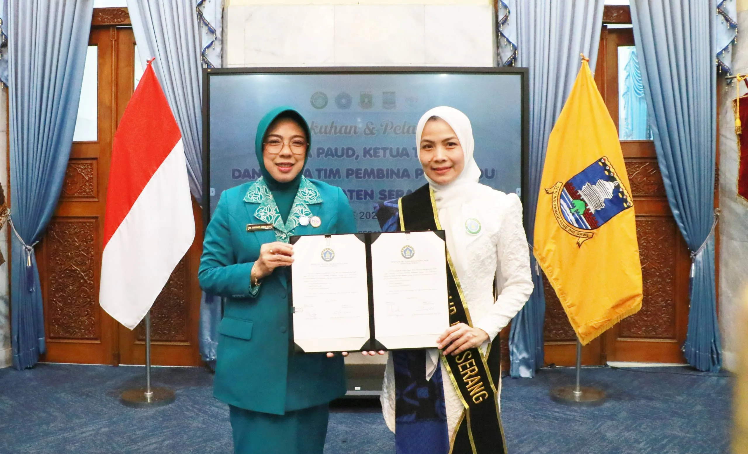 Serang – Bunda Pendidikan Anak Usia Dini atau Bunda PAUD Provinsi Banten, Tinawati Andra Soni melantik Bupati Serang Ratu Rachmatuzakiyah sebagai Bunda PAUD Kabupaten Serang Periode 2025-2030 di Pendopo Bupati Serang pada Jum’at, 4 Juli 2025.