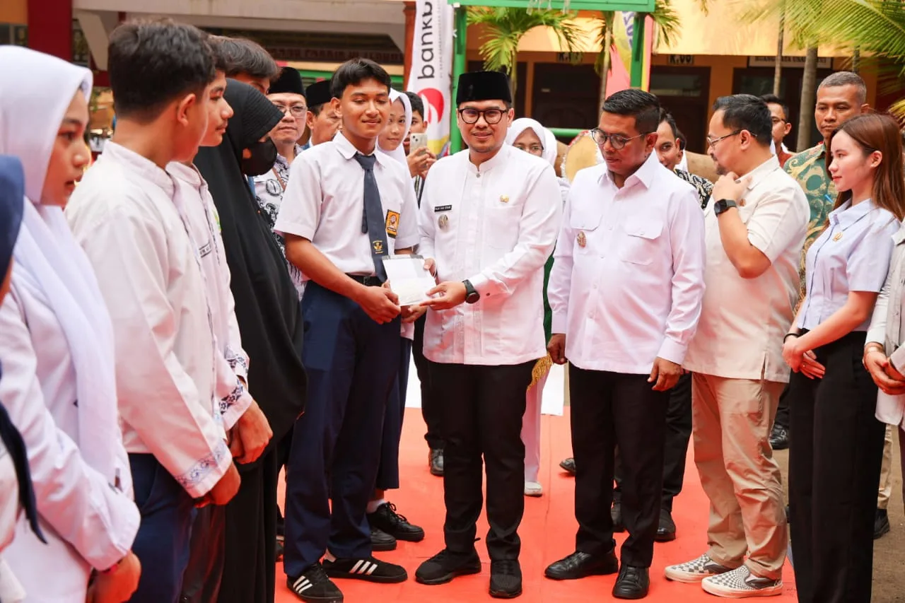 Tangsel – Gubernur Banten Andra Soni menyerahkan buku tabungan Program Sekolah Gratis Tahun Ajaran 2025/2026 untuk kelas 10 Provinsi Banten. Program Sekolah gratis merupakan komitmen Pemerintah Provinsi Banten terhadap pemerataan akses pendidikan serta keseriusan Pemprov Banten dalam menjalankan Program Sekolah Gratis untuk tingkat SMA/SMK/SKh swasta se-Banten.