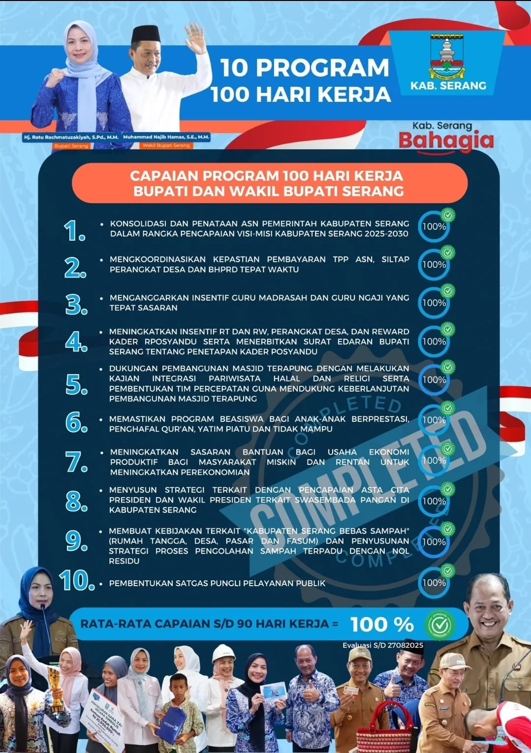 Serang, Krakataupos.com – Pemerintah Kabupaten (Pemkab) Serang mengklaim seluruh program prioritas 100 hari kerja Bupati Hj. Ratu Rachmatulzakyah dan Wakil Bupati Muhammad Najib Hamas telah tercapai 100 persen.