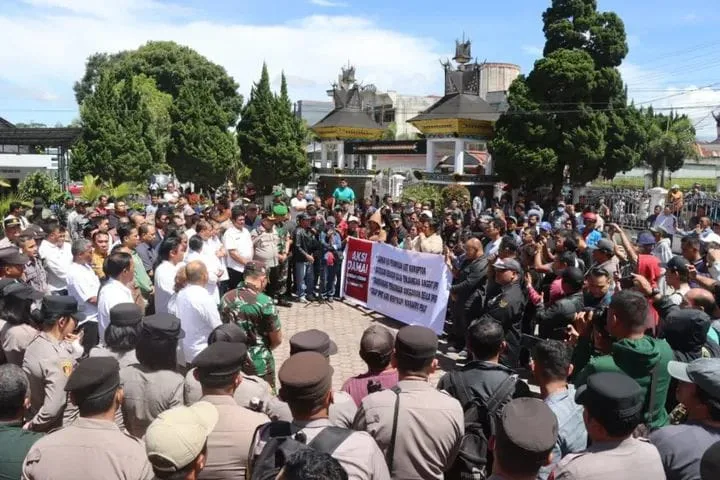 Puluhan massa yang tergabung dalam Rakyat Karo Bersuara menggelar aksi damai di depan gedung DPRD Karo.