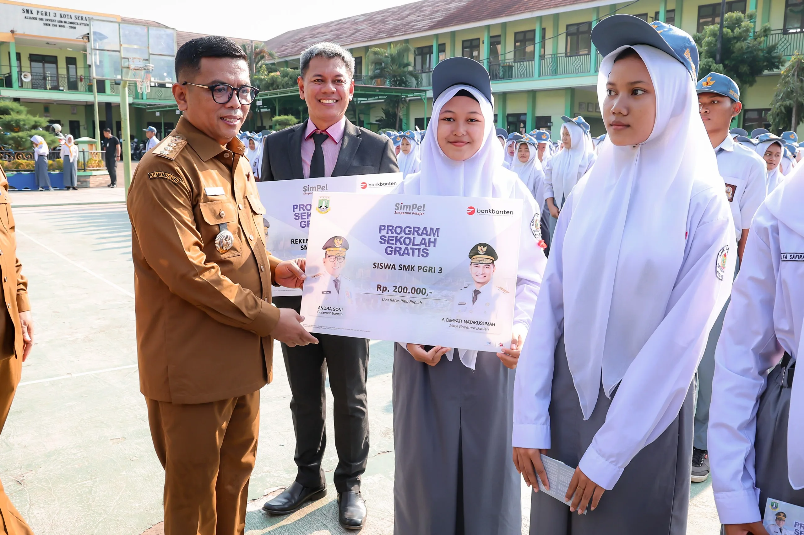 Gubernur menyerahkan secara simbolis rekening koran untuk SMK PGRI 3 dalam Program Sekolah Gratis. Perwakilan siswa menerima buku tabungan sekolah gratis.