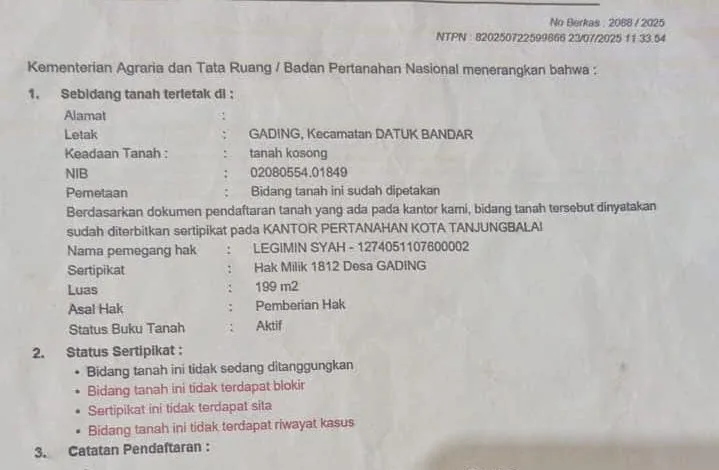 Adapun Nomer Surat Sertipikat Tanah Hak Milik atas tanah ialah No.1812/Desa Gading seluas Seratus Sembilan Puluh Sembilan meter persegi ( 199 m2) dengan Nomor Identifikasi Bidang (NIB) 02080554.0149 ,Tanah Hak Milik yang sudah di petakan terletak di Gading, Kecamatan Datuk Bandar,Tanjung Balai.