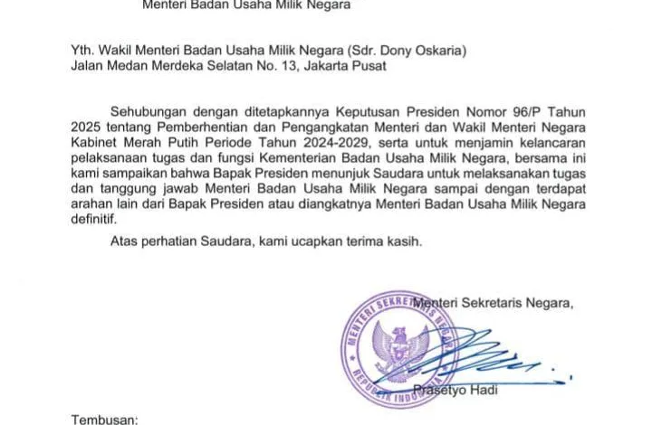 Publik baru-baru ini dikejutkan oleh beredarnya surat dari Menteri Sekretaris Negara (Mensekneg) Nomor B-20/M/S/AN.00.03/09/2025 tanggal 17 September 2025. Surat tersebut menyampaikan bahwa Presiden menunjuk Wakil Menteri BUMN, Dony Oskaria, untuk melaksanakan tugas Menteri BUMN sampai dengan adanya pengangkatan menteri definitif.