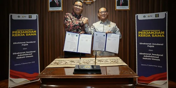 Jakarta – Direktorat Jenderal Pajak (DJP) Kementerian Keuangan dan Direktorat Jenderal Administrasi Hukum Umum (Ditjen AHU) Kementerian Hukum dan HAM memperkuat kerja sama melalui penandatanganan Perjanjian Kerja Sama (PKS) di Gedung Cakti KPDJP, Kamis 11 September 2025. Penandatanganan dilakukan oleh Dirjen Pajak, Bimo Wijayanto, dan Dirjen AHU, Widodo.