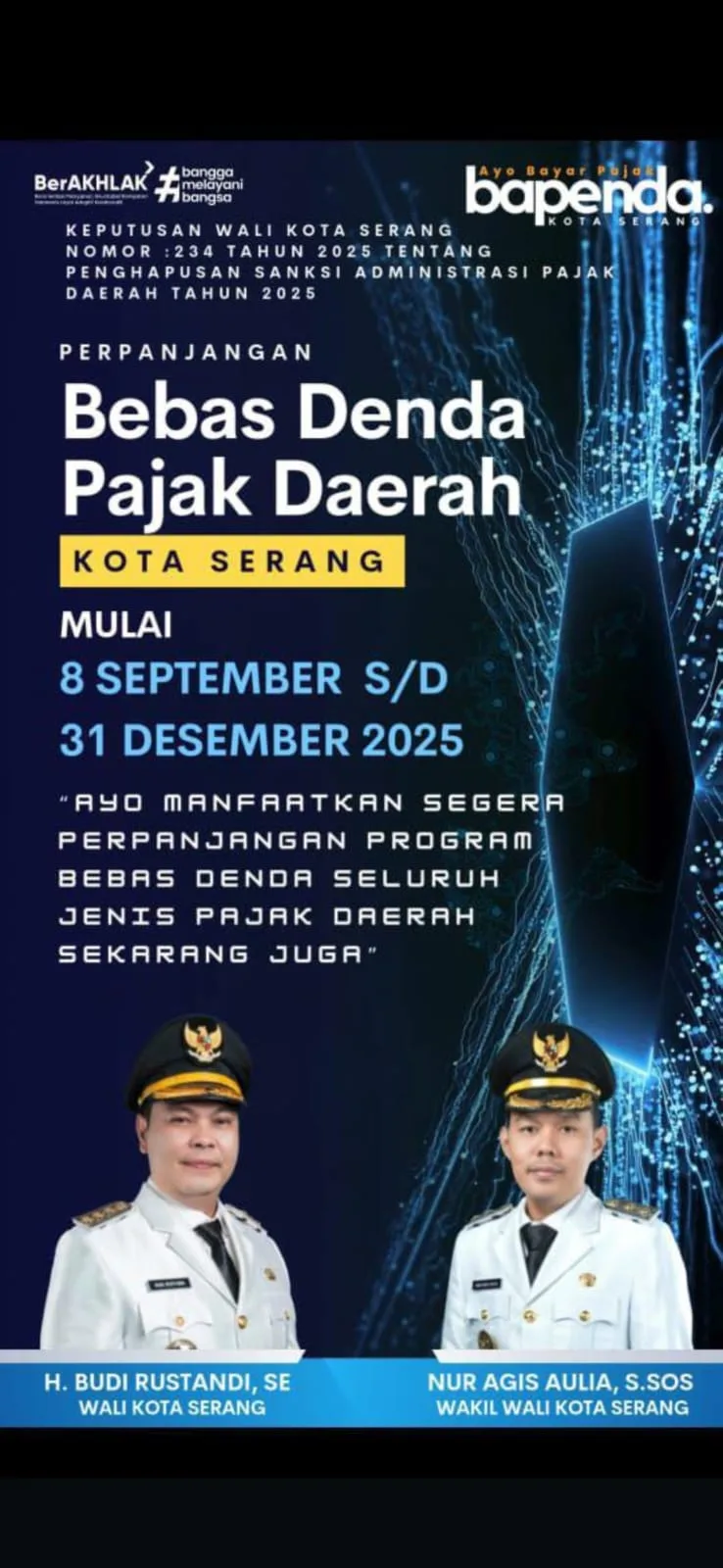 Wali Kota Serang, H. Budi Rustandi, SE, bersama Wakil Wali Kota, Nur Agis Aulia, S.Sos, mengajak masyarakat untuk memanfaatkan kesempatan ini.