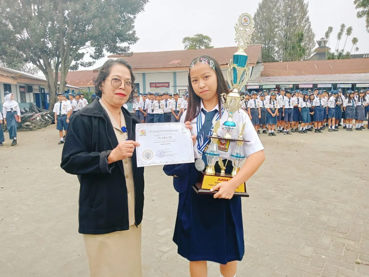 Mengharumkan Sekolah ! SMP Negeri 1 Kabanjahe Sematkan Hadiah Thropy dan Sertifikat Kejuaraan Kepada Ocha Br Ginting