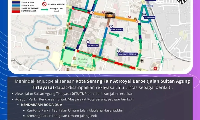 SERANG – Dinas Perhubungan (Dishub) Kota Serang menerapkan rekayasa lalu lintas dan penutupan Jalan Sultan Agung Tirtayasa seiring pelaksanaan Kota Serang Fair 2025 yang digelar di Royal Baroe, Kota Serang. Rekayasa lalu lintas mulai diberlakukan sejak Kamis, 25 Desember 2025 pukul 12.00 WIB hingga Sabtu, 27 Desember 2025 pukul 05.00 WIB.