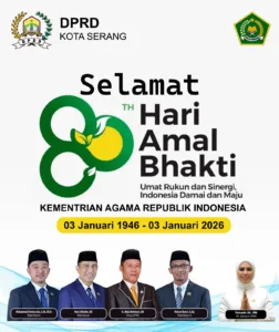 DPRD Kota Serang mengucapkan selamat memperingati Hari Bakti Kementerian Agama RI ke 80 thn. “Umat Rukun dan Sinergi, Indonesia Dama dan Maju”.
