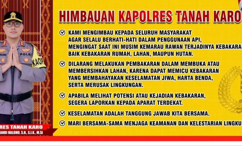 KARO SUMUT,Krakataupos.com–Kapolres Tanah Karo, AKBP Febriandi Haloho, S.H., S.I.K., M.Si, mengimbau seluruh masyarakat agar meningkatkan kewaspadaan dalam penggunaan api, mengingat saat ini wilayah Kabupaten Karo memasuki musim kemarau yang rawan terjadinya kebakaran.