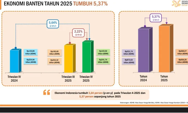 BPS mencatat ekonomi Banten sepanjang 2025 tumbuh 5,37 persen dibanding 2024. Pada Triwulan IV 2025, ekonomi tumbuh 5,64 persen (year-on-year) dan 2,22 persen (quarter-to-quarter).