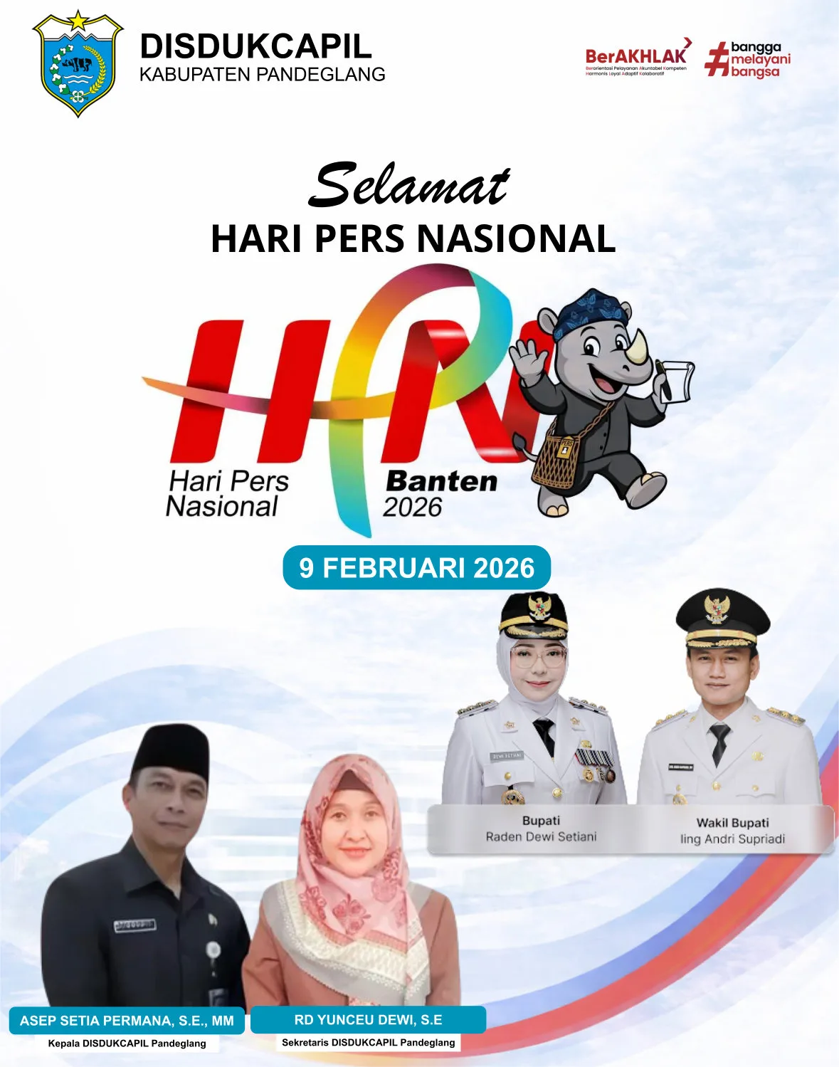 DIDUKCAPIL Kabupaten Pandeglang mengucapkan selamat memperingati Hari Pers Nasional 2026. “Pers Sehat, Ekonomi Berdaulat, Bangsa Kuat”.