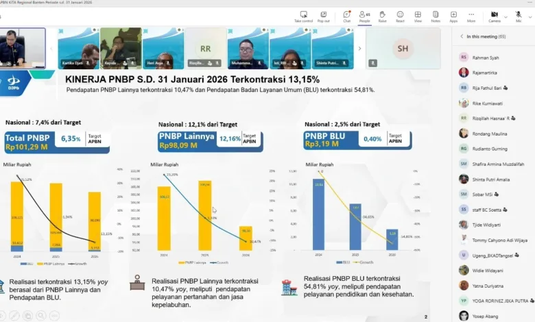 SERANG,Krakataupos.com  – Kinerja Anggaran Pendapatan dan Belanja Negara (APBN) di Provinsi Banten pada awal tahun 2026 menunjukkan tren yang tetap terjaga. Hingga 31 Januari 2026, realisasi belanja negara dan penyaluran Transfer ke Daerah (TKD) tercatat tumbuh positif, meski penerimaan negara bukan pajak (PNBP) mengalami kontraksi. Hal tersebut disampaikan jajaran pimpinan Kemenkeu Satu Regional Banten dalam pemaparan kinerja fiskal regional.
