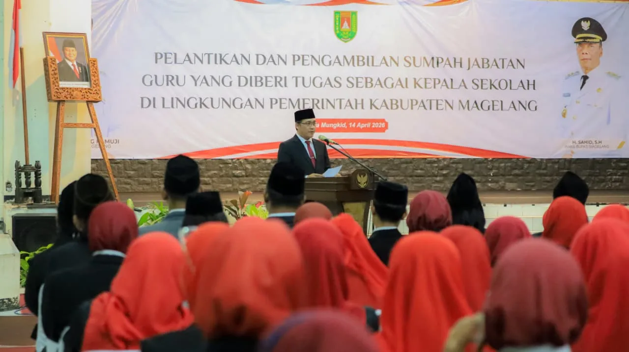 MUNGKID,Krakataupos.com – Bupati Magelang, Grengseng Pamuji, melantik sebanyak 293 kepala sekolah di lingkungan Pemerintah Kabupaten Magelang, terdiri dari 247 kepala Sekolah Dasar (SD), dan 46 kepala Sekolah Menengah Pertama (SMP). Pelantikan berlangsung di GOR Gemilang Kompleks Setda Kabupaten Magelang, Selasa (14/4/2026).