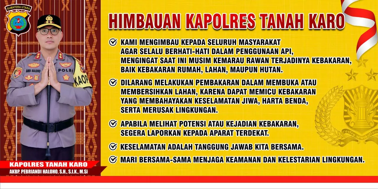 KARO SUMUT,Krakataupos.comKapolres Tanah Karo, AKBP Febriandi Haloho, S.H., S.I.K., M.Si, mengimbau seluruh masyarakat agar meningkatkan kewaspadaan dalam penggunaan api, mengingat saat ini wilayah Kabupaten Karo memasuki musim kemarau yang rawan terjadinya kebakaran.