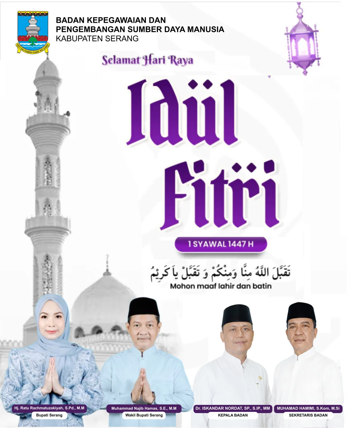 BKPSDM Kabupaten Serang mengucapkan Selamat Hari Raya Idul Fitri 1447 H/2026 M. Taqaballahu Minna Wa Minkum “Mohon Maaf Lahir & Batin”